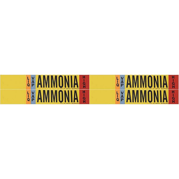 Pipe Marker, Pipe Marker Mounting Style Adhesive Pipe Marker, Pipe Marker Legend Ammonia, Legend Text Color Black, Blue, Orange, Red, White, IIAR System Abbreviation (Blank), IIAR Phase LIQ/VAP, IIAR Pressure Level High, Background Color Yellow, With or Without Arrows Without