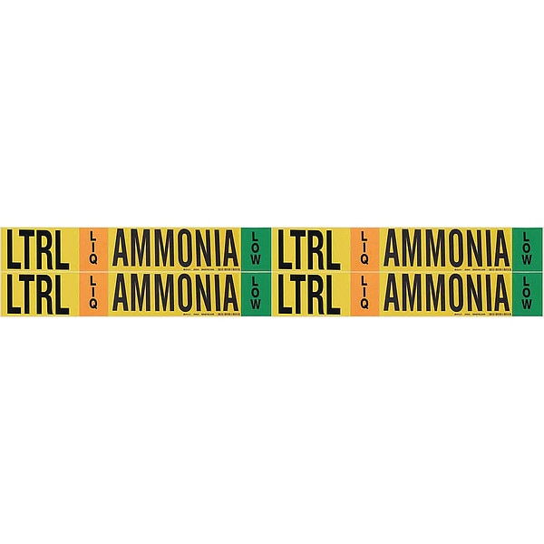 Pipe Marker, Pipe Marker Mounting Style Adhesive Pipe Marker, Pipe Marker Legend Ammonia, Legend Text Color Black, Green, Orange, White, IIAR System Abbreviation LTRL, IIAR Phase LIQ, IIAR Pressure Level Low, Character Height 3/4 in, Background Color Yellow, With or Without Arrows Without