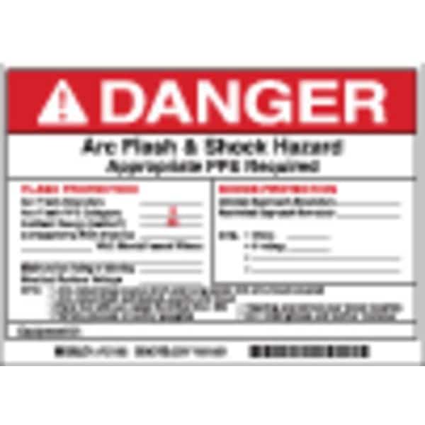 Permanent Adhesive Label, Horizontal Rectangle, Number of Printed Sides 1, English, Sign Format ANSI/OSHA Format, Sign Legend Arc Flash & Shock Hazard Appropriate Ppe Required Flash Protection Arc Flash Boundary ___ Hazard Risk Category 3, Sign Legend Style Symbol and Text, Package Quantity 5
