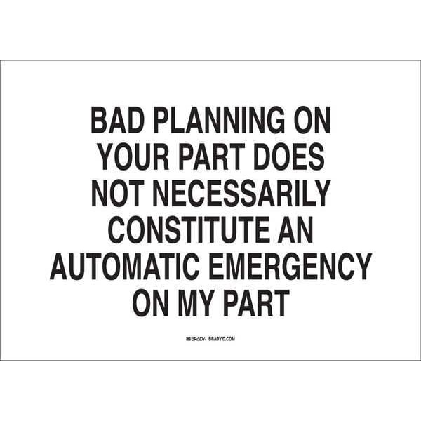 Facility Sign, Sign Subject Matter Humor, Height 7 In., Width 10 In., Sign Material Plastic, Sign Mounting Style With Mounting Holes, Header No Header, Legend Bad Planning On Your Part Does Not Necessarily Constitute An Automatic Emergency On My Part, Printed Language English, Sign Shape Rectangle