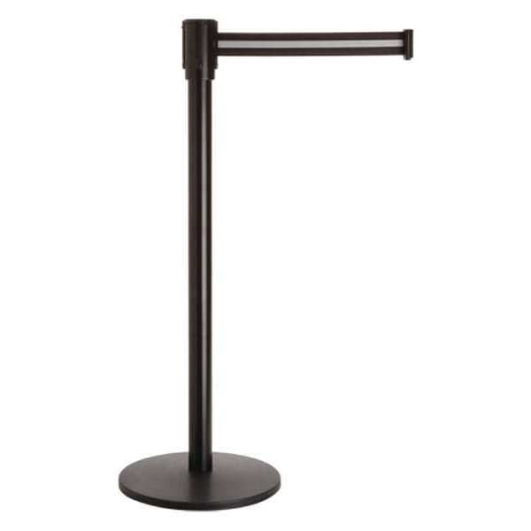 Barrier Post with Belt, Maximum Overall Height 40 in, Legend No Legend, Legend Color Not Applicable, Number of Belts 1, Belt Length 7 1/2 ft, Belt Width 2 in, Belt Color Black/White, Post Color Black, Product Type Stanchion, Minimum Overall Height Not Applicable, Post Diameter 2 in, Post Material Steel, Post Finish Non Reflective Black, Base Type Round Flat, Base Diameter 14 in, Base Material Steel, Base Finish Black, Base Color Black, ADA Compliance No, Height Adjustability Fixed Height