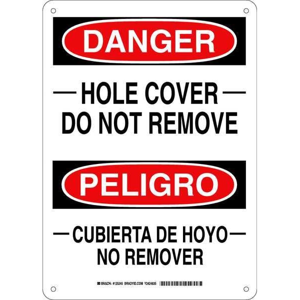 Danger Sign, Sign Subject Matter Accident Prevention, Height 14 In., Width 10 In., Sign Material Plastic, Sign Mounting Style With Mounting Holes, Header Danger/Peligro, Legend _____Hole Cover____Do Not Remove/____Cubierta De Hoyo____No Remover, Printed Language English, Spanish, Sign Shape Rectangle