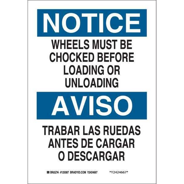 Bilingual Safety Sign, Sign Subject Matter Chock Wheels, Height 10 In., Width 7 In., Sign Material Polyester, Sign Mounting Style Adhesive Surface, Header Notice/Aviso, Legend Wheels Must Be Chocked Before Loading Or Unloading/ Trabar Las Ruedas Antes De Cargar O Descargar, Printed Language English, Spanish, Sign Shape Rectangle