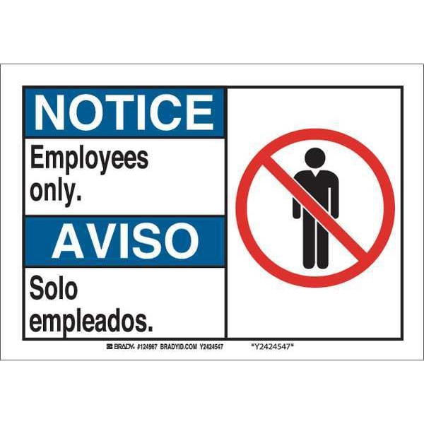 Bilingual Safety Sign, Sign Subject Matter Employees and Visitors, Height 10 in, Width 14 in, Sign Material Polyester, Sign Mounting Style Adhesive Surface, Header Notice/Aviso, Legend Employees Only./Solo Empleados., Printed Language English, Spanish, Sign Shape Rectangle