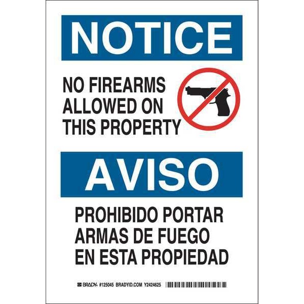 Bilingual Safety Sign, Sign Subject Matter Weapons, Devices or Substances, Height 10 in, Width 7 in, Sign Material Polyester, Sign Mounting Style Adhesive Surface, Header Notice/Aviso, Legend No Firearms Allowed On This Property/No Se Permiten Armas De Fuego En Esta Propiedad, Printed Language English, Spanish, Sign Shape Rectangle