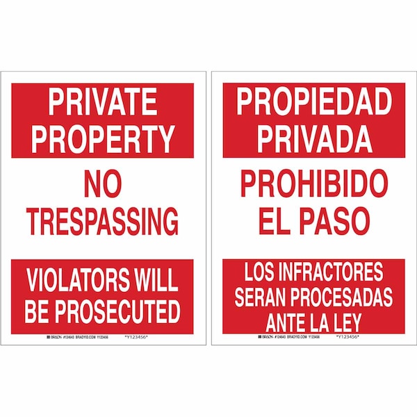 Bilingual Safety Sign, Sign Subject Matter Trespassing and Property, Height 12 in, Width 18 in, Sign Material Aluminum, Sign Mounting Style With Mounting Holes, Header Private Property/Propiedad Privada, Legend No Trespassing Violators Will Be Prosecuted/Prohibdo El Paso Los Infractores Seran Procesadas Ante La Ley, Printed Language English, Spanish, Sign Shape Rectangle