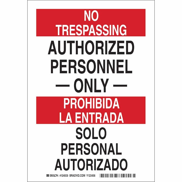 Bilingual Safety Sign, Sign Subject Matter Authorized Personnel and Restricted Access, Height 14 in, Width 10 in, Sign Material Aluminum, Sign Mounting Style With Mounting Holes, Header No Trespassing/Prohibida La Entrada, Legend Authorized Personnel ____Only____/Solo Personal Autorizado, Printed Language English, Spanish, Sign Shape Rectangle