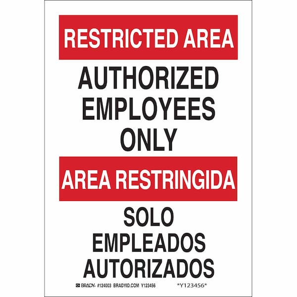 Bilingual Safety Sign, Sign Subject Matter Authorized Personnel and Restricted Access, Height 14 in, Width 10 in, Sign Material Polyester, Sign Mounting Style Adhesive Surface, Header Restricted Area/Area Restringida, Legend Authorized Employees Only/Solo Empleados Autorizados, Printed Language English, Spanish, Sign Shape Rectangle