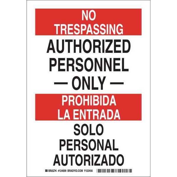 Bilingual Safety Sign, Sign Subject Matter Authorized Personnel and Restricted Access, Height 14 in, Width 10 in, Sign Material Polyester, Sign Mounting Style Adhesive Surface, Header No Trespassing/Prohibida La Entrada, Legend Authorized Personnel ____Only____/Solo Personal Autorizado, Printed Language English, Spanish, Sign Shape Rectangle