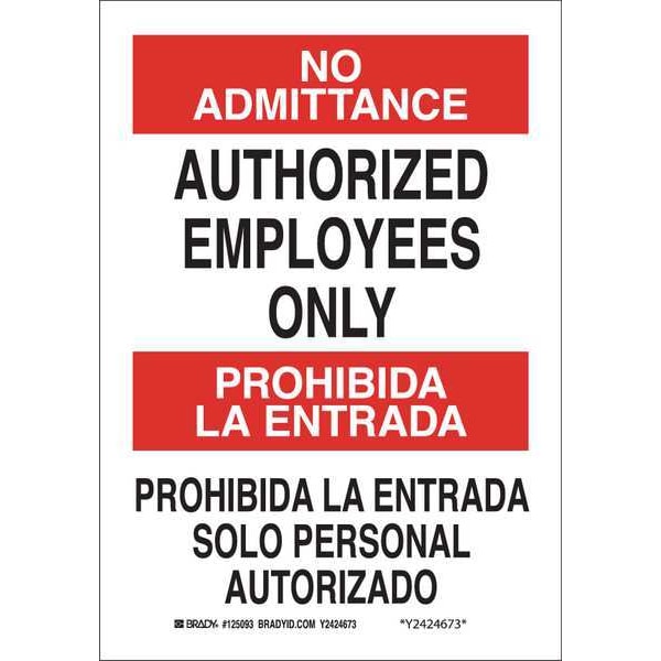 Bilingual Safety Sign, Sign Subject Matter Authorized Personnel and Restricted Access, Height 14 in, Width 10 in, Sign Material Polyester, Sign Mounting Style Adhesive Surface, Header No Admittance/Prohibida La Entrada, Legend Authorized Employees Only/Solo Personal Autorizado, Printed Language English, Spanish, Sign Shape Rectangle