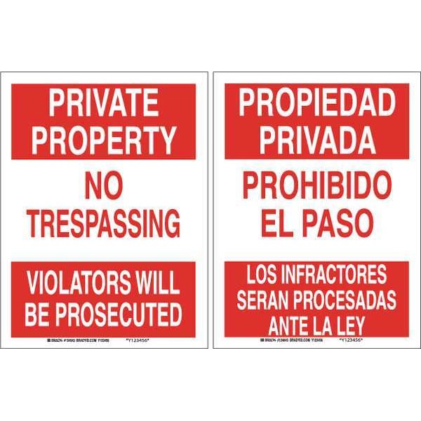 Bilingual Safety Sign, Sign Subject Matter Trespassing and Property, Height 18 in, Width 24 in, Sign Material Plastic, Sign Mounting Style With Mounting Holes, Header Private Property/Propiedad Privada, Legend No Trespassing Violators Will Be Prosecuted/Prohibdo El Paso Los infractores Seran Procesadas Ante La Ley, Printed Language English, Spanish, Sign Shape Rectangle