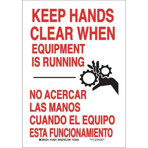 Bilingual Safety Sign, Sign Subject Matter Keep Hands Clear, Height 10 in, Width 7 in, Sign Material Plastic, Sign Mounting Style With Mounting Holes, Header No Header, Legend Keep Hands Clear When Equipment Is Running/No Acer, Printed Language English, Spanish, Sign Shape Rectangle