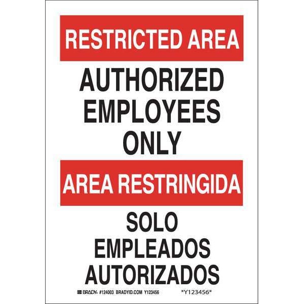 Bilingual Safety Sign, Sign Subject Matter Authorized Personnel and Restricted Access, Height 10 in, Width 7 in, Sign Material Polyester, Sign Mounting Style Adhesive Surface, Header Restricted Area/Area Restringida, Legend Authorized Employees Only/Solo Empleados Autorizados, Printed Language English, Spanish, Sign Shape Rectangle