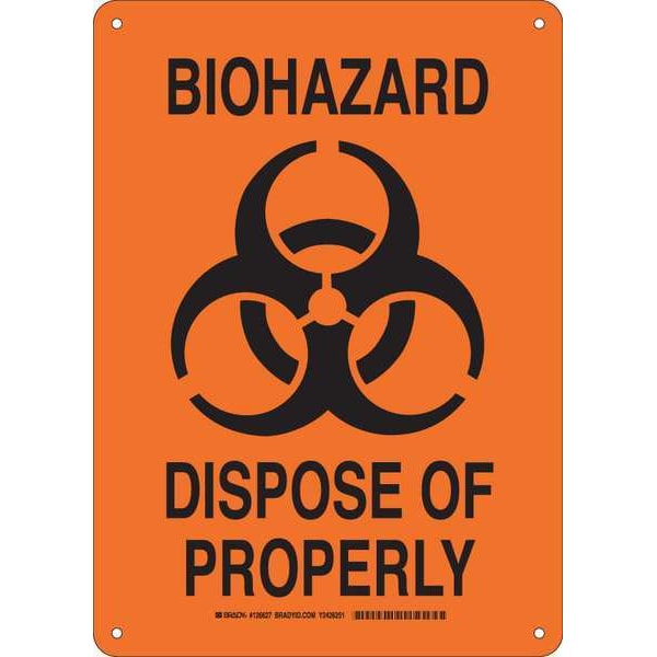 Biohazard Sign, Sign Subject Matter Biohazard, Height 14 in, Width 10 in, Sign Material Aluminum, Header No Header, Legend Biohazard Dispose Of Properly, Printed Language English, Sign Shape Rectangle