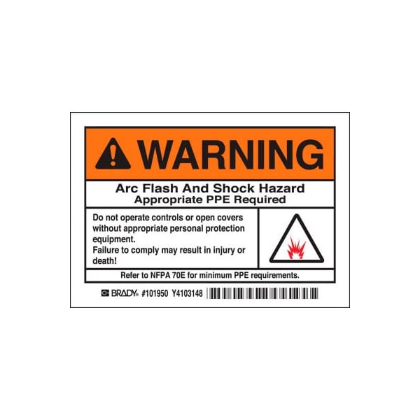 Brady 1011950 Arc Flash Labels, Warning Arc Flash And Shock Hazzard, 3-1/2in X 5in, Blk/Orng/Wht