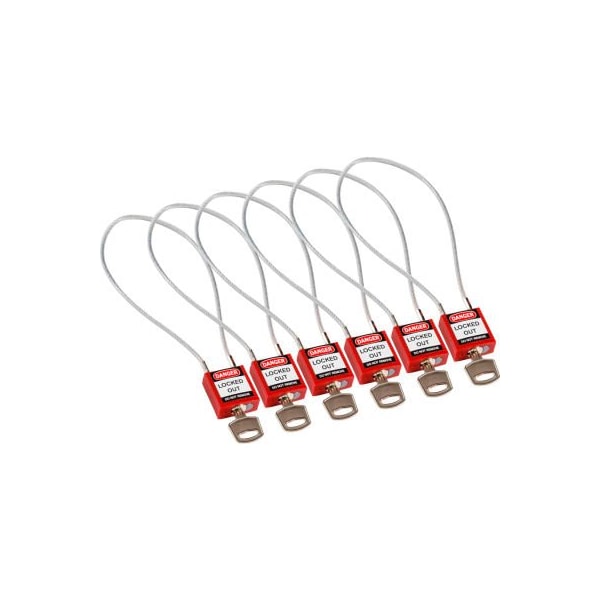Brady 146132 Cable Safety Padlocks, Keyed Alike, 8"H Clearance Steel Cable, Red, 6/Pack