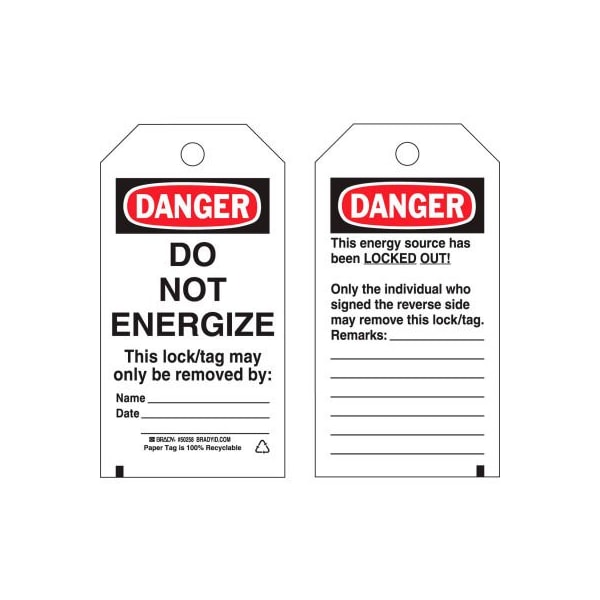 Brady 50258 lockout tag- danger do not energize, 2 sided, hd polyester, 25/pack heavy duty polyester (b-837) plastic tags are encapsulated in matte polyester laminate for superior durability during lockout and tagout situations. Write-on polyester laminate protects the graphics, wipes clean and withstands water, grease and extreme temperatures. Durable heavy duty polyester material with brass grommets exceeds osha's 50 lb pull force requirement for tagout devices. Excellent chemical, oil and water resistance. Lockout tags: danger: do not energize this lock/tag may only be removed.