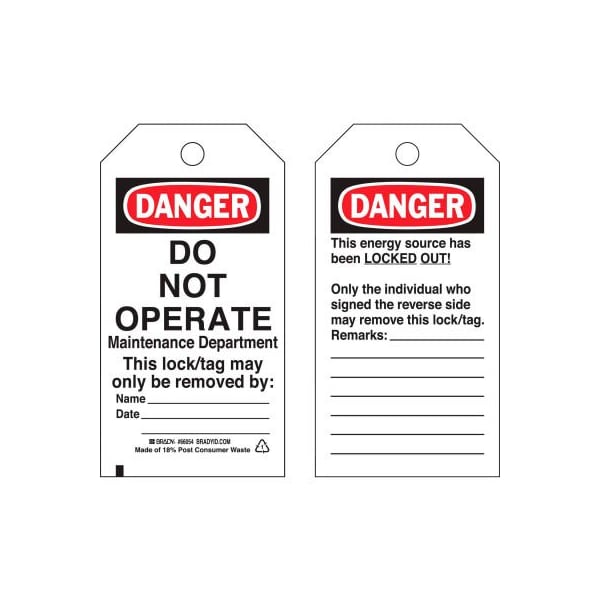 Brady 65521 lockout tag- danger do not operate, 2 sided, cardstock, 25/pack heavy duty polyester (b-837) plastic tags are encapsulated in matte polyester laminate for superior durability during lockout and tagout situations. Write-on polyester laminate protects the graphics, wipes clean and withstands water, grease and extreme temperatures. Durable heavy duty polyester material with brass grommets exceeds osha's 50 lb pull force requirement for tagout devices. Excellent chemical, oil and water resistance. Lockout tags: danger: do not operate maintenance department.