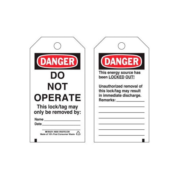 Brady 66050 lockout tag- danger do not operate, 2 sided heavy duty, polyester, 25/pack features: b-851 rigid economy polyester with brass grommets, exceeds osha's 50 lb pull force requirement for tagout devices textured write-on surface allows for authorized signatures, dates and other special instructions withstands moisture, grease and dirt stays legible longer than cardstock