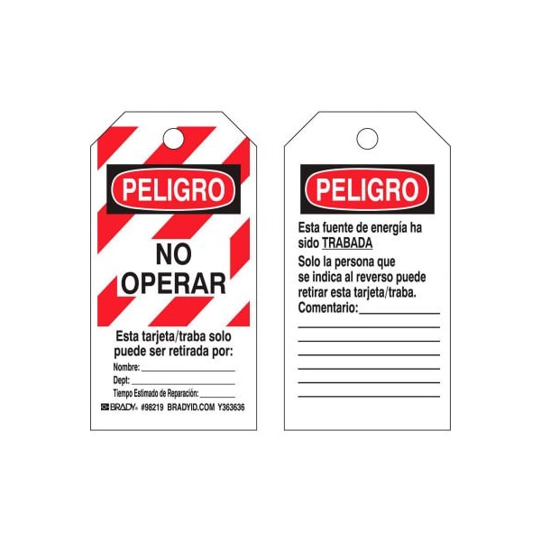 Brady 98219 Lockout Tag- Peligro No Operar, Spanish, 2 Sided, Polyester, 25/Pack