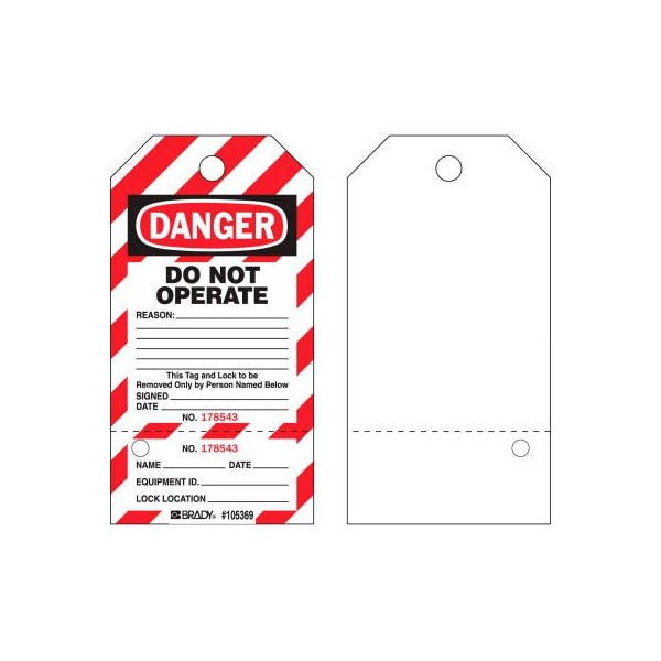Brady wkt3 danger do not operate locked out tag, two-part tags with stubs, cardstock, 25/pack two-part tags enhance operational control and record-keeping by enabling workers to keep the stubs after attaching the tags, then later give them to managers for verification. The excellent write-on surface of b-853 cardstock is ideal for adding on-the-spot customized notes and other information. Paper cardstock tags are recommended for indoor use only. 1 in. Diameter metal ring provided for attaching stub to key. Lockout tags: danger: do not operate.