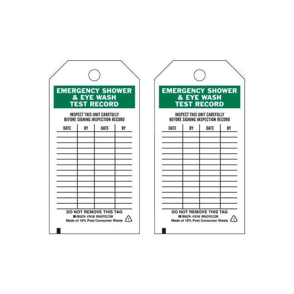 Brady Emergency Shower & Eye Wash Test Record Tag, Polyester, 3inW x 5-3/4inH, 25/Pkg