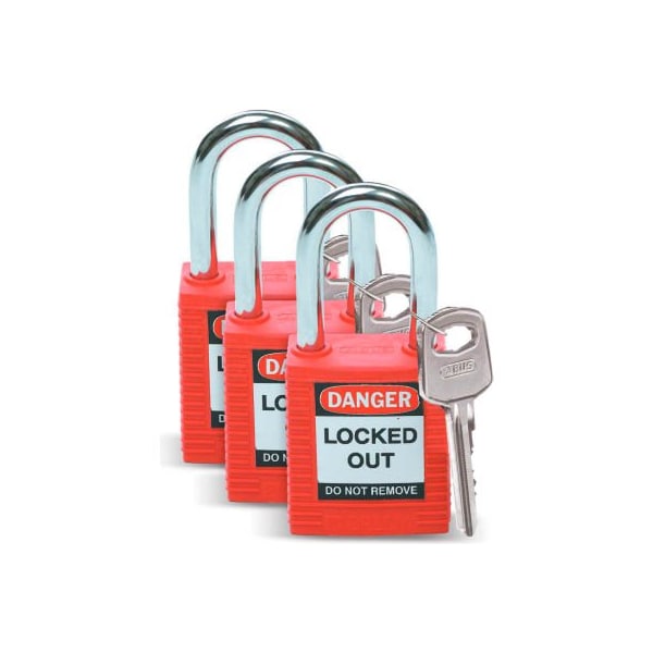 Brady 105886 lockout padlock, keyed alike, 1-1/2", plastic covered steel, red, 3/pack safety padlocks from brady have nonconductive fiberglass-reinforced nylon bodies and unique key cylinders that prevent electricity from traveling from the shackle to the key. Padlocks feature lightweight, nonconductive fiberglass-reinforced nylon bodies, hardened steel shackles and tamper-resistant 6-pin cylinders. These lightweight padlocks comply with all osha requirements and offer superior temperature, chemical and corrosion-resistance. Non-conductive safety padlocks are a preferred alternative to metal locks for lockout applications. includes: (3) padlocks (3) english labels (3) french labels (3) spanish labels (3) keys
