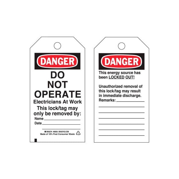 Brady 65504 lockout tag- danger do not operate electricians at work, vinyl, 25/pack heavy duty polyester (b-837) plastic tags are encapsulated in matte polyester laminate for superior durability during lockout and tagout situations. Write-on polyester laminate protects the graphics, wipes clean and withstands water, grease and extreme temperatures. Durable heavy duty polyester material with brass grommets exceeds osha's 50 lb pull force requirement for tagout devices. Excellent chemical, oil and water resistance. Lockout tags: danger: do not operate electricians at work. This lock/tag may only be removed by: