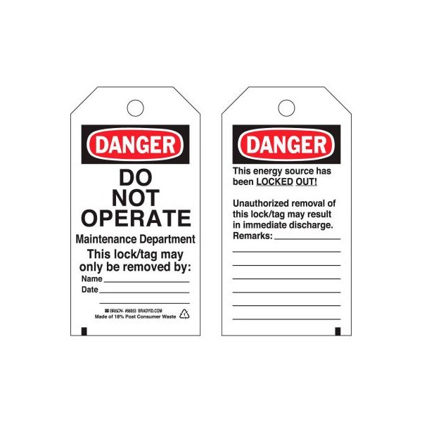 Brady 65503 lockout tag- danger do not operate, heavy duty polyester encapsulated, 25/pack heavy duty polyester (b-837) plastic tags are encapsulated in matte polyester laminate for superior durability during lockout and tagout situations. Write-on polyester laminate protects the graphics, wipes clean and withstands water, grease and extreme temperatures. Durable heavy duty polyester material with brass grommets exceeds osha's 50 lb pull force requirement for tagout devices. Excellent chemical, oil and water resistance. Lockout tags: danger: do not operate, maintenance department this lock/tag may only be removed by: