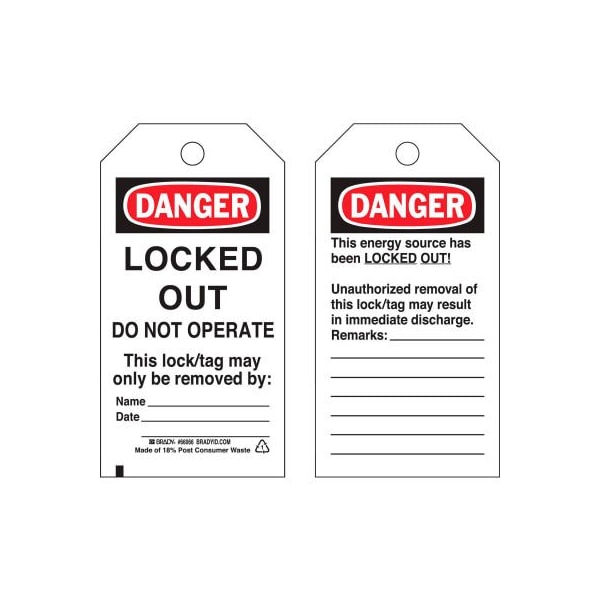 Brady 66066 lockout tag- danger locked out do not operate, 2 sided, polyester, 25/pack economy polyester b-851 tags are perfect for marking on-the-spot warnings of dangerous conditions. B-851 rigid economy polyester with brass grommets, exceeds osha's 50 lb pull force requirement for tagout devices. Textured write-on surface allows for authorized signatures, dates and other special instructions. Withstands moisture, grease and dirt. Lockout tags: danger: locked out do not operate.