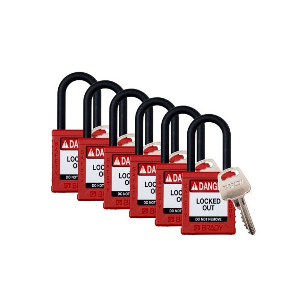 Brady Safety Lockout Padlock, Keyed Different, 1-1/2in, Plastic/Nylon, Red, 6/PK (Discontinued)