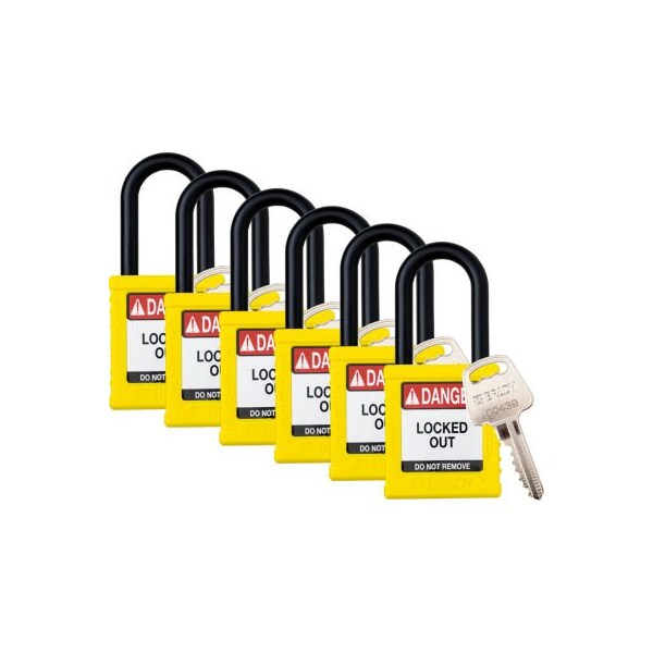 Brady Safety Lockout Padlock, Keyed Different, 1-1/2in, Plastic/Nylon, Yellow, 6/PK