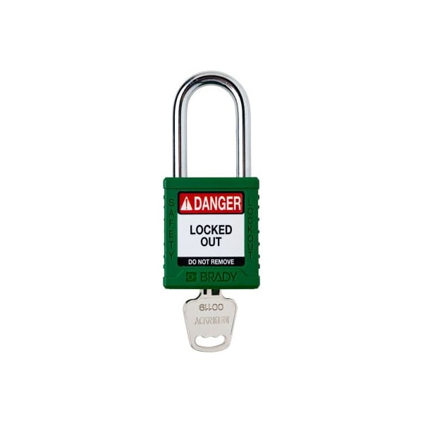 Brady Safety Lockout Padlock, Keyed Different, 1-1/2in, Plastic/Steel, Green