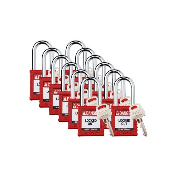 Brady Safety Lockout Padlock, Keyed Different, 1-1/2in, Plastic/Steel, Red, 12/PK