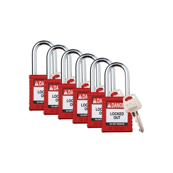 Brady Safety Lockout Padlock, Keyed Different, 1-1/2in, Plastic/Steel, Red, 6/PK