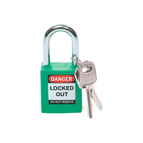 Brady 99564 safety lockout padlock with label, 1-1/2", 1 key, plastic covered steel, green safety padlocks from brady have nonconductive fiberglass-reinforced nylon bodies and unique key cylinders that prevent electricity from traveling from the shackle to the key. Padlocks feature lightweight, nonconductive fiberglass-reinforced nylon bodies, hardened steel shackles and tamper-resistant 6-pin cylinders. These lightweight padlocks comply with all osha requirements and offer superior temperature, chemical and corrosion-resistance. Non-conductive safety padlocks are a preferred alternative to metal locks for lockout applications. includes: (1) padlock (1) english label (1) french label (1) spanish label (1) key