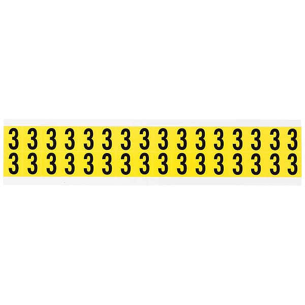 Number Label, Adhesive Type Removable and Repositionable Adhesive, Application General Identification, Wire and Cable Labeling, APWA Compliant Color No, Background Color Yellow, Character Color Black, Character Color Gradient Solid Color, Character Height 5/8 in, Character Outline Color Not Applicable, Character Type Numbers, Characters Included 3, Die Cut Yes, Embossed No, Font Gothic, Includes (32) Labels, Indoor/Outdoor Usage Indoor Only, Letter Casing Uppercase, Material Vinyl Cloth