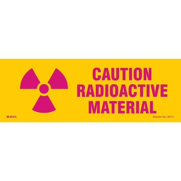 Caution Radiation Sign, Sign Subject Matter Radiation and X-Ray, Height 3 1/2 in, Width 10 in, Sign Material Vinyl, Sign Mounting Style Surface, Legend Caution Radioactive Material, Printed Language English, Sign Shape Rectangle