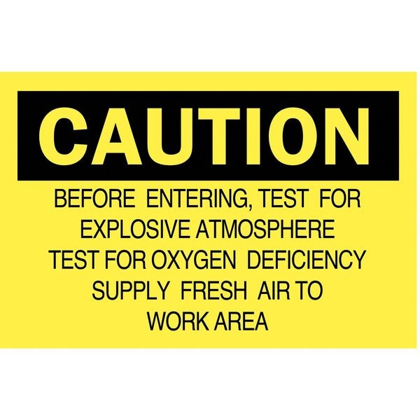 Caution Sign, Sign Subject Matter Chemical, Gas or Hazardous Materials, Height 10 in, Width 14 in, Sign Material Aluminum, Header Caution, Legend Before Entering, Test For Explosive Atmosphere Test For Oxygen Deficiency Supply Fresh Air To Work Area, Printed Language English, Sign Shape Rectangle