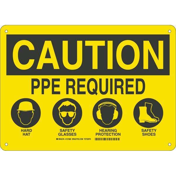 Caution Sign, Sign Subject Matter Personal Protection, Height 10 in, Width 14 in, Sign Material Fiberglass, Header Caution, Legend PPE Required Hard Hat Safety Glasses Hearing Protection Safety Shoes, Printed Language English, Sign Shape Rectangle