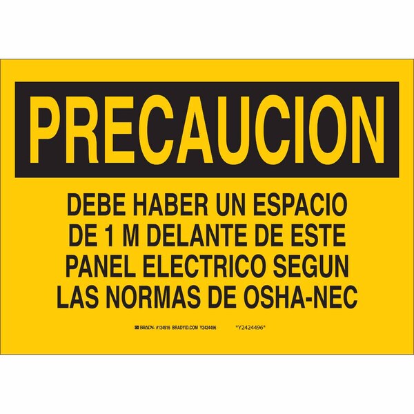 Caution Sign, Sign Subject Matter Electrical Hazard, Height 10 in, Width 14 in, Sign Material Polyester, Header Precaucion, Legend Debe Haber Un Espacio De 1 M Delante De Este Panel, Printed Language Spanish, Sign Shape Rectangle