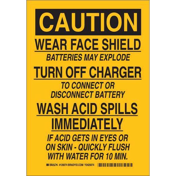 Caution Sign, Sign Subject Matter Personal Protection, Height 10 in, Width 7 in, Sign Material Plastic, Header Caution, Legend Wear Face Shield Batteries May Explode Turn Off Charger To Connect Or Disconnect Battery Wash Acid Spills Immediately If Acid Gets In Eyes Or On Skin - Quickly Flush With Water For 10 M in, Printed Language English, Sign Shape Rectangle