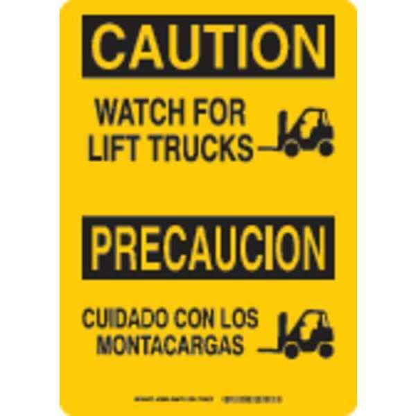 Caution Sign, Sign Subject Matter Lift Truck Traffic, Height 14 In., Width 10 In., Sign Material Aluminum, Header Caution/Precaucion, Legend Watch For Lift Trucks/Cuidado Con Los Montacargas, Printed Language English, Spanish, Sign Shape Rectangle