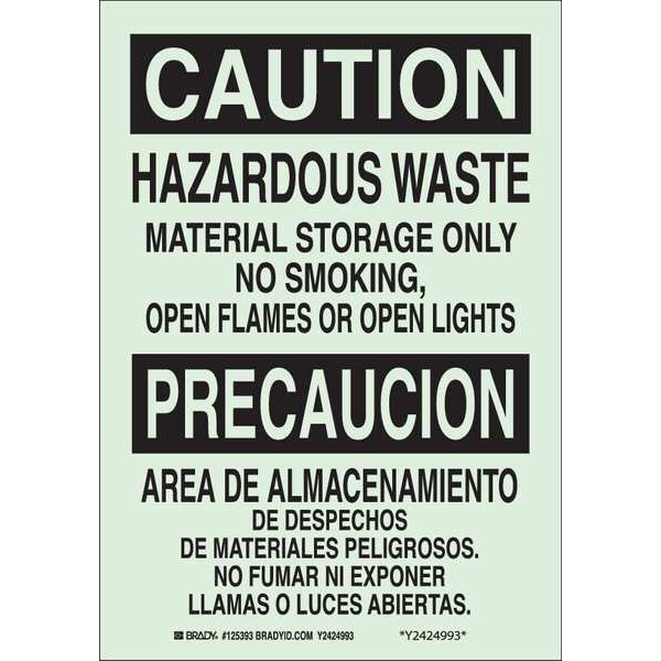 Caution Sign, Sign Subject Matter Chemical, Gas or Hazardous Materials, Height 14 in, Width 10 in, Sign Material Polyester, Header Caution/Precaucion, Legend Hazardous Waste Material Storage Only No Smoking, Open Flames Or Open Lights, Printed Language English, Spanish, Sign Shape Rectangle