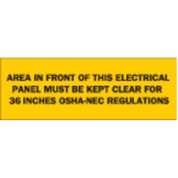 Caution Sign, Sign Subject Matter Electrical Hazard, Height 3 1/2 in, Width 10 in, Sign Material Polyester, Header No Header, Legend Area In Front of This Electrical Panel Must Be Kept Clear For 36 In OSHA-NEC Regulations, Printed Language English, Sign Shape Rectangle