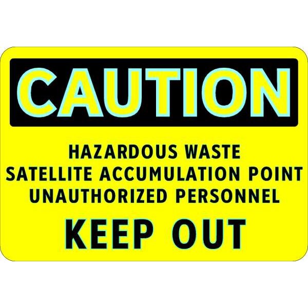 Caution Sign, Sign Subject Matter Chemical, Gas or Hazardous Materials, Height 7 in, Width 10 in, Sign Material Aluminum, Header Caution, Legend Hazardous Waste Satellite Accumulation Point Unauthorized Personnel Keep Out, Printed Language English, Sign Shape Rectangle