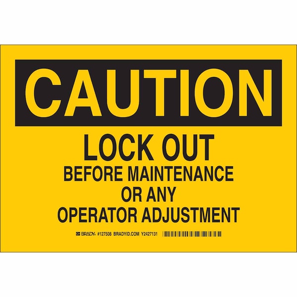 Caution Sign, Sign Subject Matter Lockout Tagout, Height 7 in, Width 10 in, Sign Material Plastic, Header Caution, Legend Lock Out Before Maintenance Or Any Operator Adjustment, Printed Language English, Sign Shape Rectangle