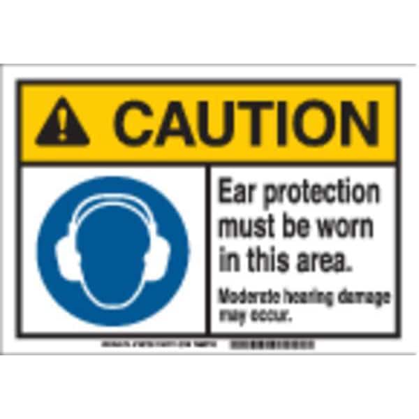 Caution Sign, Sign Subject Matter Personal Protection, Height 7 in, Width 10 in, Sign Material Plastic, Sign Mounting Style With Mounting Holes, Header Caution, Legend Ear Protection Must Be Worn In This Area. Moderate Hearing Damage May Occur., Printed Language English, Sign Shape Rectangle