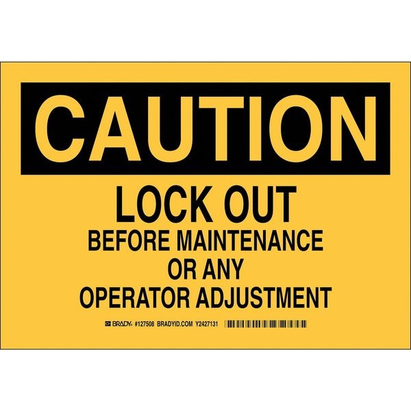 Caution Sign, Sign Subject Matter Lockout Tagout, Height 7 in, Width 10 in, Sign Material Polyester, Header Caution, Legend Lock Out Before Maintenance Or Any Operator Adjustment, Printed Language English, Sign Shape Rectangle