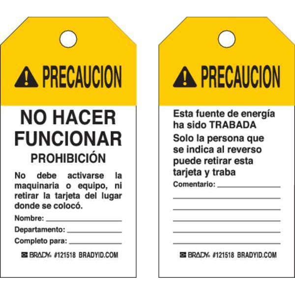 Caution Tag, Front Side Legend No Hacer Funcionar Prohibicion No Debe Activarse La Maquinaria O Equipo, Ni Retirar La Tarjeta Del, Header Precaution, Language Spanish, Legend Type Text, Mount Type Nylon Ties, Number of Printed Sides 2, Overall Height 5 3/4 in, Overall Width 3 in, Reverse Side Legend Esta Fuente De Energia Ha Ado Trabada Solo La Persona Que Se indica Al Reverso Puede Retirar Esta Tarjeta Traba Comentario, Sign Background Color White, Sign Material Polyester